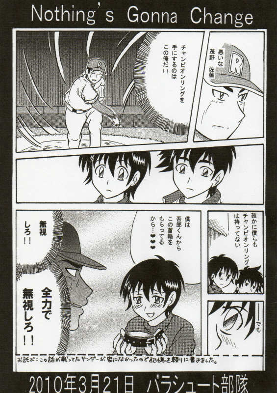ただし、夢で見たOVA下巻は、絵はかわぐちかいじ先生でしたが吾郎と寿也はいつも通りマウンドでキャッキャウフフしてまして、ホーネッツナインは「またイチャコラしてら(^-^)」と優しく見守るという、腐女子には優しい内容でしたよ。