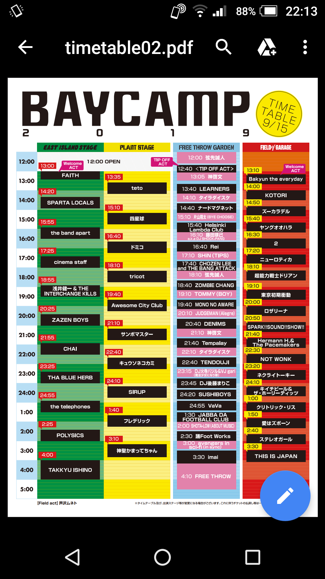 毎年この時期はお台場で開催される【ultra japan】に行ってたんですけど今年のウルトラジャパンはテクノ系アーティストが全然出ないのと(後で知りましたがテクノ系は15日夜に渋谷WOMBで出ていました)、今年のベイキャンプのヘッドライナーが我が神・石野卓球だったのと、卓球と同日にアニメジャ2のOPを歌っているキュウソネコカミが出るので『超えていけ』を生で聴けるかも⁉ という淡い期待からベイキャンプ行きを決めたのでありました。